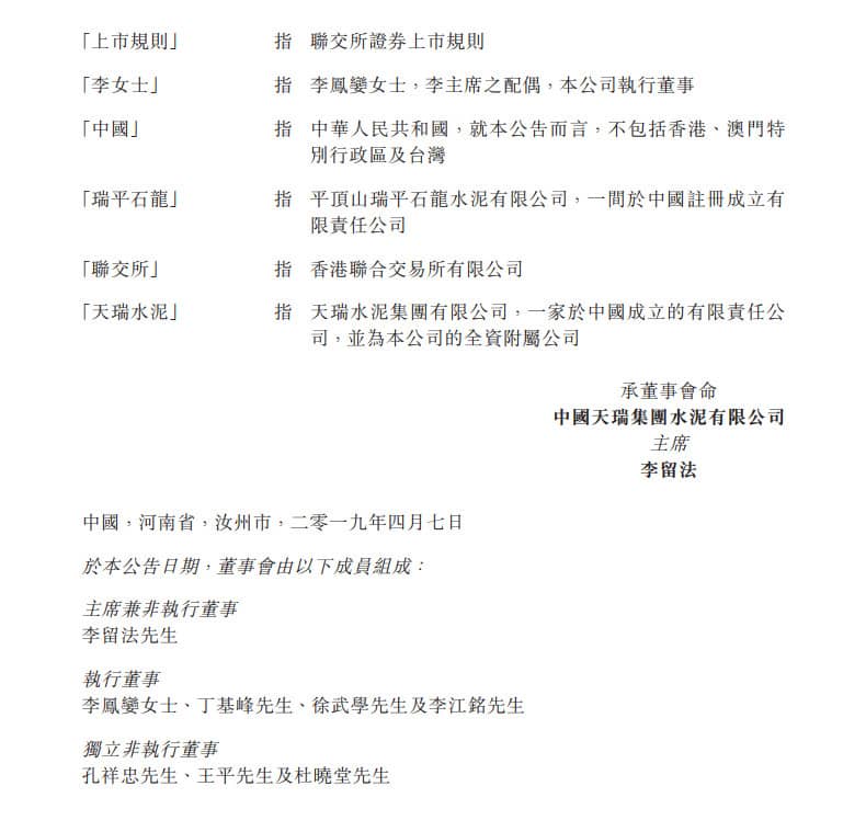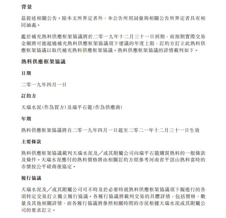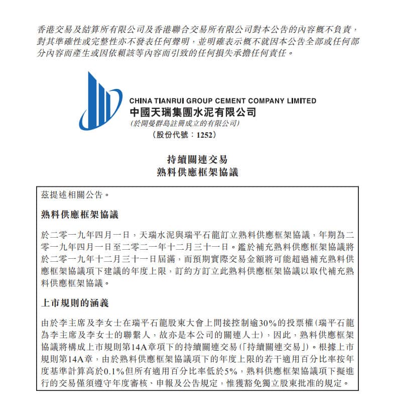水泥人网网最新消息:中国天瑞水泥4月7日公布,2019年4月1日,天瑞水泥与瑞平石龙订立熟料供应框架协议,年期为2019年4月1日至2021年12月31日。