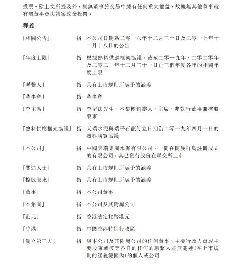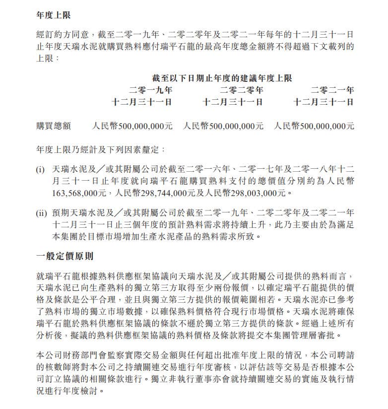 经订约方同意,截至2019年、2020年及2021年每年的12月31日止年度天瑞水泥就购买熟料应付瑞平石龙的最高年度总金额将不得超过人民币5亿元、5亿元、5亿元。