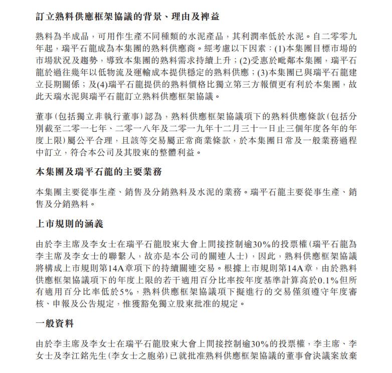 (4)瑞平石龙提供的熟料价格比独立第三方报价更有利于集团,故此天瑞水泥与瑞平石龙订立熟料供应框架协议。