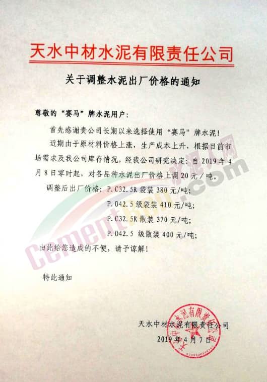 昨日(4月8日)天水中材水泥有限责任公司发通知上调水泥价格,各品牌水泥出厂价上调20元/吨。调整后市场主流产品PC32.5R包装水泥执行380元/吨,PO42.5散装水泥执行400元/吨。