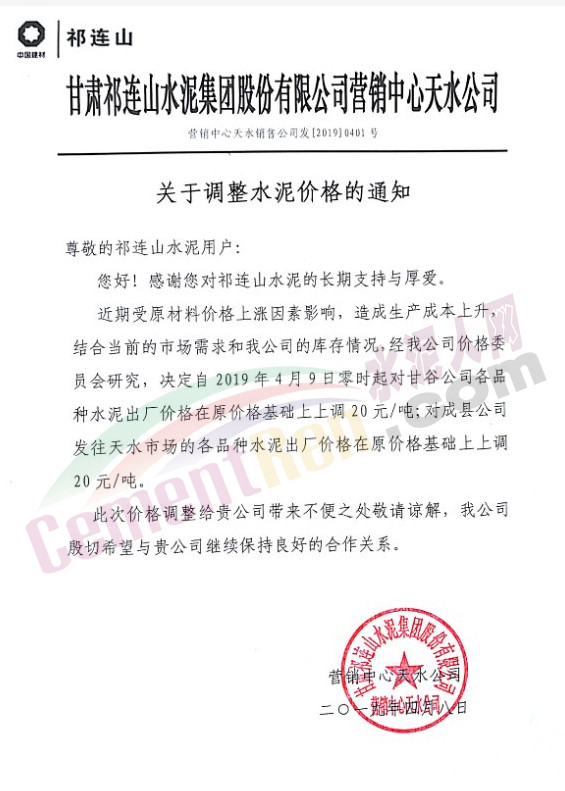 祁连山水泥天水公司通知自4月9日零时起对甘谷公司各品种水泥出厂价在原价格基础上上调20元/吨。对成县公司发往天水市场的各品种水泥出厂价格在原价格基础上上调20元/吨。