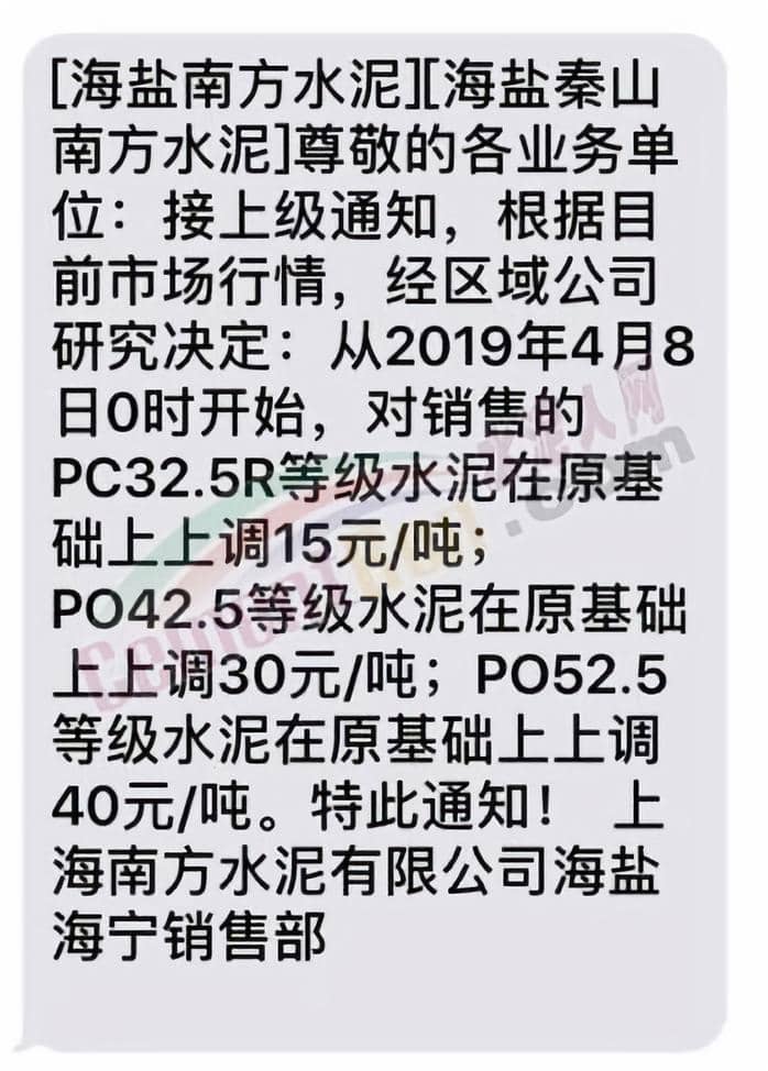 同期海盐南方水泥,海盐秦山南方水泥发布通知称,根据目前市场行情,经研究决定:从4月8日0时起,对销售PC32.5等级水泥在原基础上上调15元/吨。PO42.5水泥在原基础上上调30元/吨。PO52.5等级水泥在原基础上上调40元/吨。