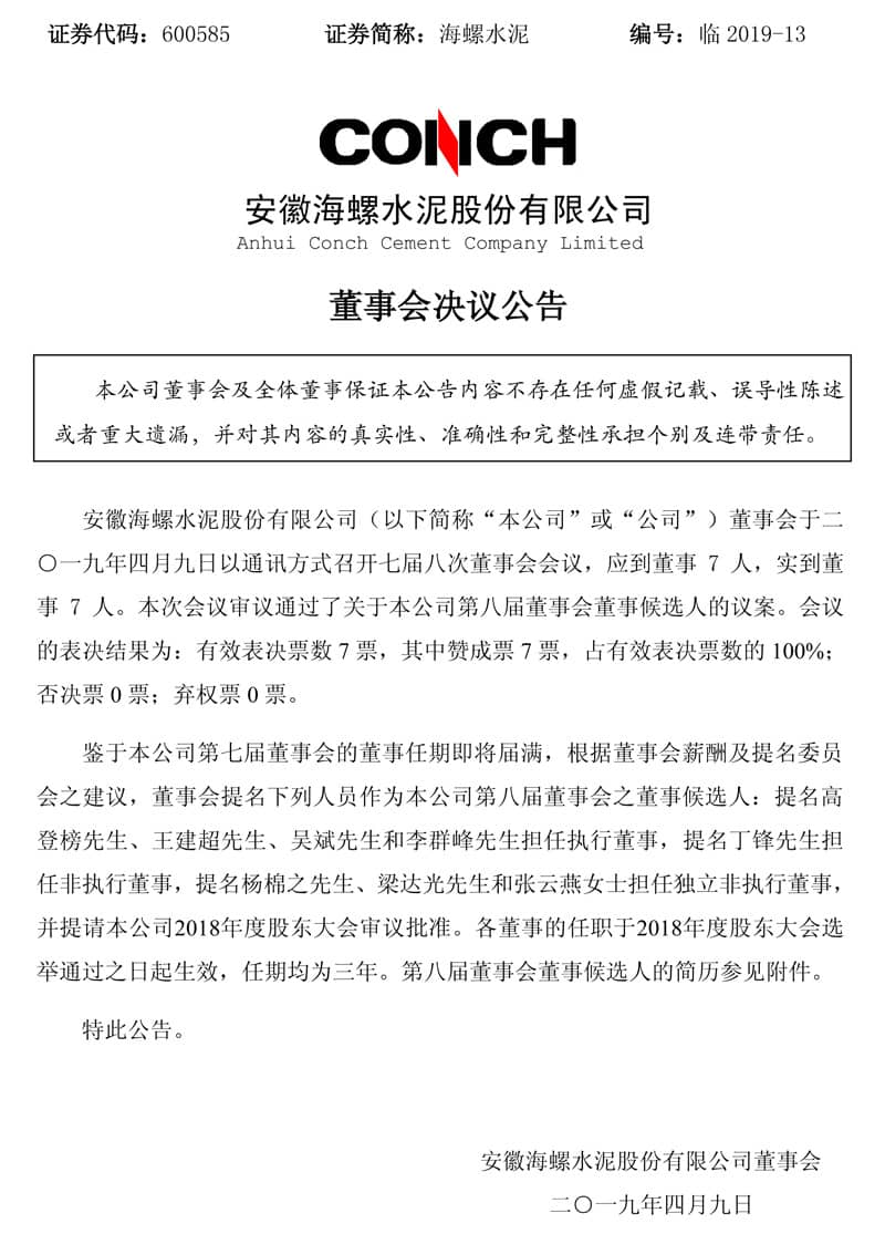 水泥人网消息:海螺水泥公布,鉴于公司第七届董事会的董事任期即将届满,根据董事会薪酬及提名委员会之建议,董事会提名下列人员作为公司第八届董事会之候任董事:高登榜、王建超、吴斌和李群峰担任执行董事,丁锋担任非执行董事,及杨棉之、梁达光和张云燕担任独立非执行董事,并提请公司股东周年大会审议批准。各候任董事的任职于2018年度股东大会选举通过之日起生效,任期均为三年,直至第八届董事会任期完结。