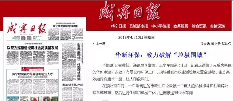 《咸宁日报》4月10日报道:1日,记者走进位于赤壁高新区的华新水泥(赤壁)有限公司环保工厂,现场看到市政生活垃圾处置全过程,生态高效如同变魔术一般,让人印象深刻。
