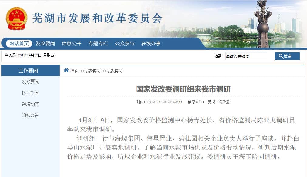 水泥人网消息:4月8日-9日,国家发改委价格监测中心杨青处长、安徽省价格监测局陈亚戈调研员率队到芜湖市调研。