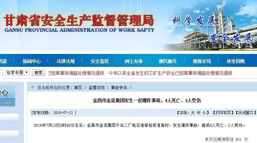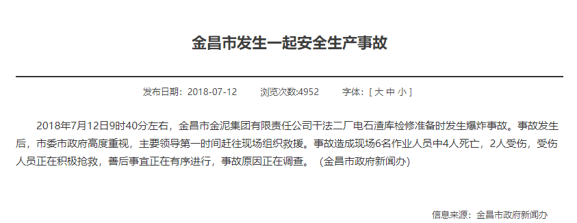 2018年7月12日9时40分左右,金昌水泥(集团)有限责任公司新型干法水泥二厂电石渣库发生一起爆炸事故,造成现场4人死亡、2人受伤,直接经济损失494万元。后经调查认定金泥集团公司干法二厂“7.12”爆炸事故是由于违章指挥、违章作业导致的一起较大生产安全责任事故。