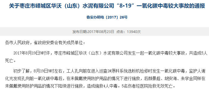 也是在山东省,2017年8月19日9时许,位于枣庄市峄城区的华沃(山东)水泥有限公司原料车间在检修过程中发生一起一氧化碳较大中毒事故,造成1人中毒,4人因施救不当中毒,5人经抢救无效死亡,直接经济损失约699万元。经调查认定,这是一起较大生产安全责任事故。