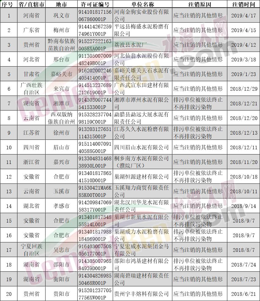 撤销排污许可证的水泥制造企业名单