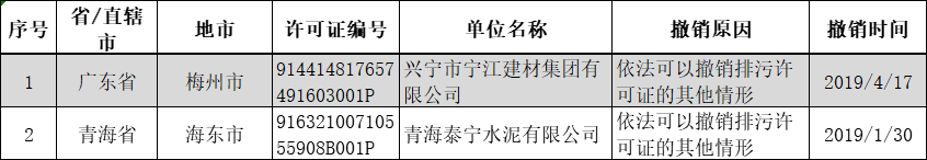 许可证公告撤销的水泥制造企业共有两家,分别为兴宁市宁江建材集团有限公司和青海泰宁水泥有限公司,撤销原因为依法可以撤销排污许可证的其他情形。