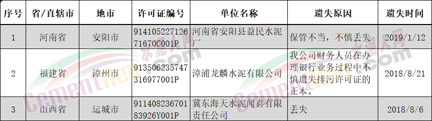 发布排污许可证遗失声明的三家水泥制造企业有河南省安阳县益民水泥厂、漳浦龙麟水泥有限公司和冀东海天水泥闻喜有限责任公司。