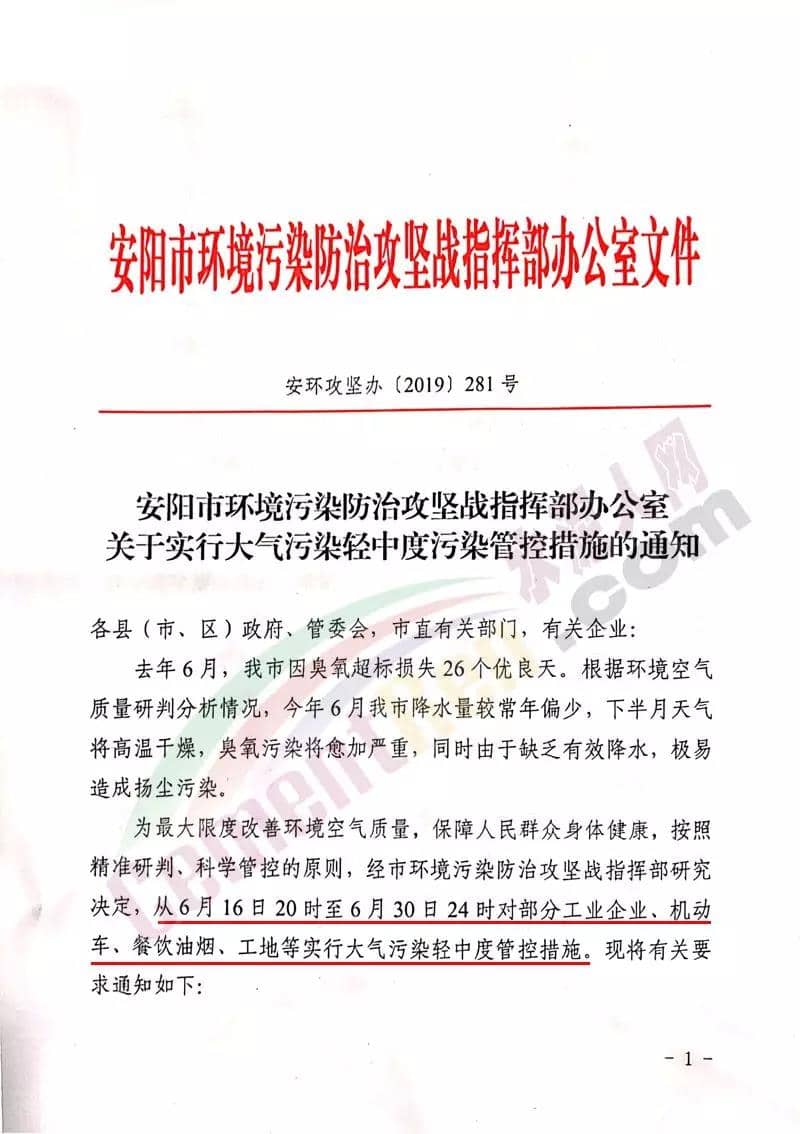 水泥人网通讯员消息:日前,河南省安阳市环境污染防治攻坚战指挥部发布安环攻坚办【2019】281号文件《关于实行大气污染轻中度污染管控措施的通知》称去年6月,安阳市因臭氧超标损失26个优良天。根据环境空气质量研判分析情况 ,今年6月安阳市降水量较常年偏少,下半月天气将高温干燥,臭氧污染将愈加严重,同时由于缺乏有效降水,极易造成扬尘污染。为最大限度改善环境空气质量,保障人民群众身体健康,按照精准研判、科学管控的原则,经安阳市环境污染防治攻坚战指挥部研究决定,从6月16日20时至6月30日24时对部分工业企业、机动车、餐饮油烟、工地等实行大气污染轻中度管控措施。