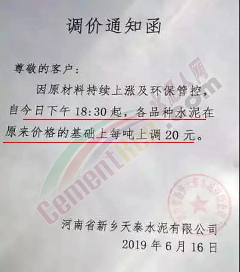 6月16日,新乡天泰水泥有限公司发布调价通知,称因原材料持续上涨及环保管控,自当日下午18:30起,各品种水泥在原有价格基础上每吨上调20元。
