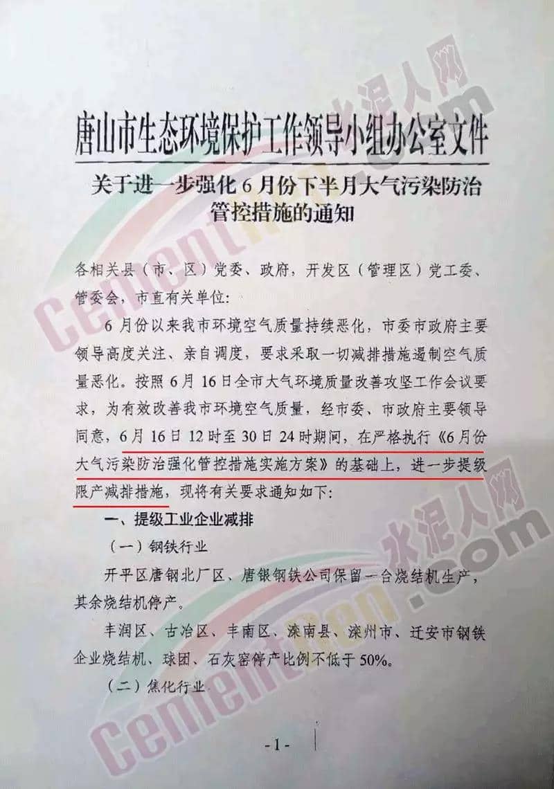 也是在6月16日,河北唐山市生态环境保护工作领导小组界定发布《关于进一步强化6月份下半月大气污染防治管控措施的通知》称:6月份以来唐山市环境空气质量持续恶化,市委市政府主要领导高度关注、亲自调度,要求采取一切减排措施遏制空气质量恶化。按照6月16日全市大气环境质量改善攻坚工作会议要求,为有效改善全市环境空气质量,经唐山市委、市政府主要领导同意,6月16日12时至30日24时期间,在严格执行《6月份大气污染强化管控措施实施方案》的基础上,进一步提级限产减排措施。