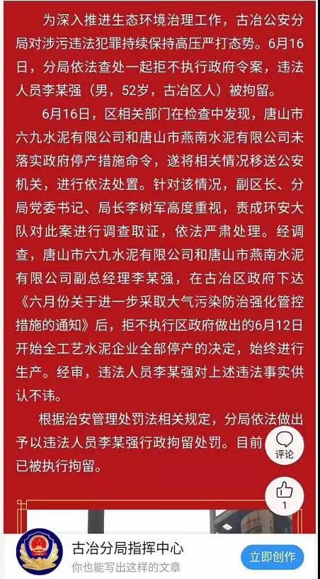 针于古冶区相关企业的管控,唐山市古冶区公安分局通报了一起拒不执行政府令案。通报称,为深入推进生态环境治理工作,古冶公安分局对涉污违法犯罪持续保持高压严打态势。6月16日,分局依法查处一起拒不执行政府令案。6月16日,区相关部门在检查中发现,唐山市六九水泥有限公司和唐山市燕南水泥有限公司未落实政府停产措施命令,遂将相关情况移送公安机关,进行依法处置。针对该情况,副区长、分局党委书记、局长李树军高度重视,责成环安大队对此案进行调查取证,依法严肃处理。经调查,唐山市六九水泥有限公司和唐山市燕南水泥有限公司副总经理李某强,在古冶区政府下达《六月份关于进一步采取大气污染防治强化管控措施的通知》后,拒不执行区政府做出的6月12日开始全工艺水企业全部停产的决定,始终进行生产。经审,违法人员李某强对上述违法事实供认不讳。根据治安管理处罚法相关规定,分局依法做出予以违法人员李某强行政拘留处罚。通报原文如下: