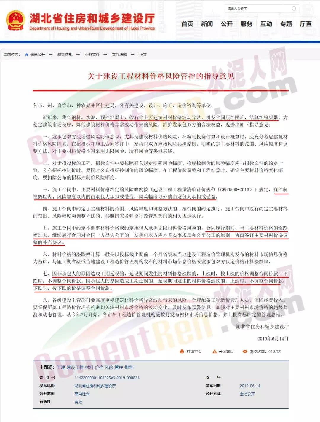 日前,湖北省住房和城乡建设厅发布《关于建设工程材料价格风险管控的指导意见》称:近年来,湖北省钢材、水泥、预拌混凝土、砂石等主要建筑材料价格波动异常,引发合同履约困难,结算纠纷频繁。为稳定建筑市场秩序,降低建筑材料价格异常波动带来的风险,维护发承包双方的合法权益,提出相关意见。