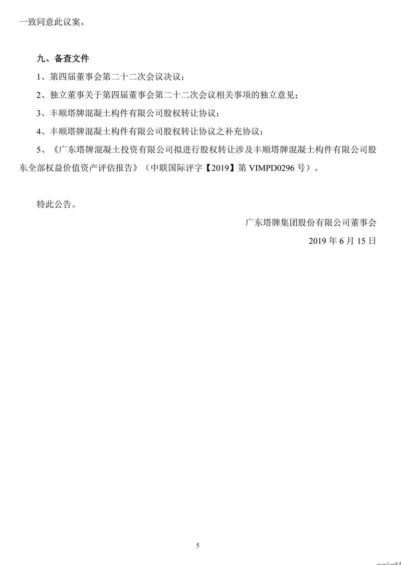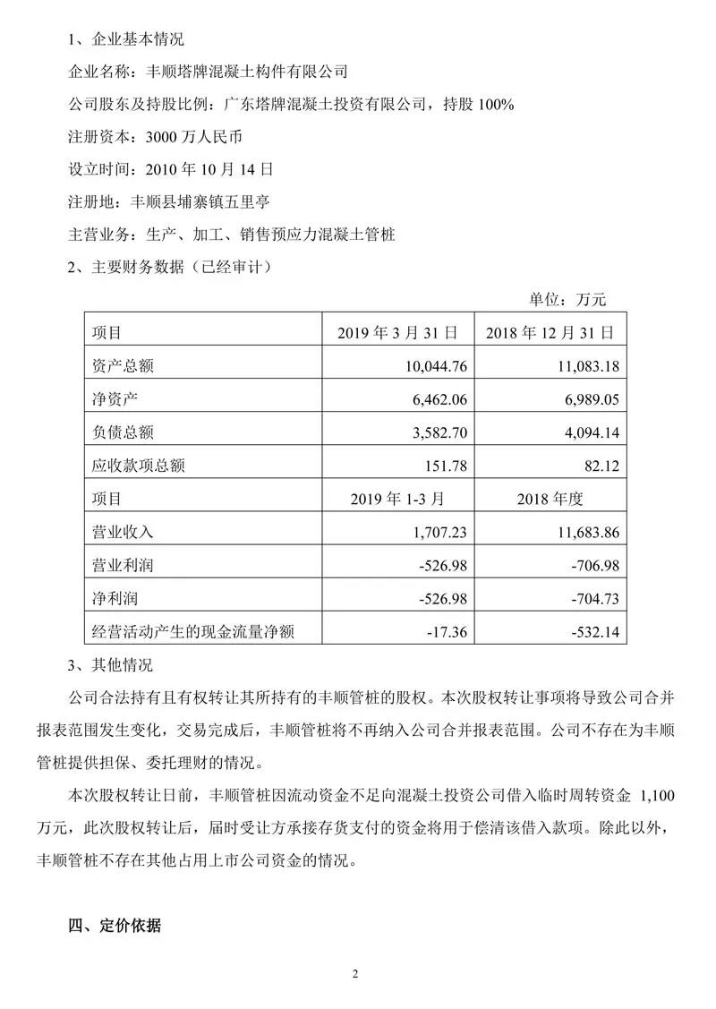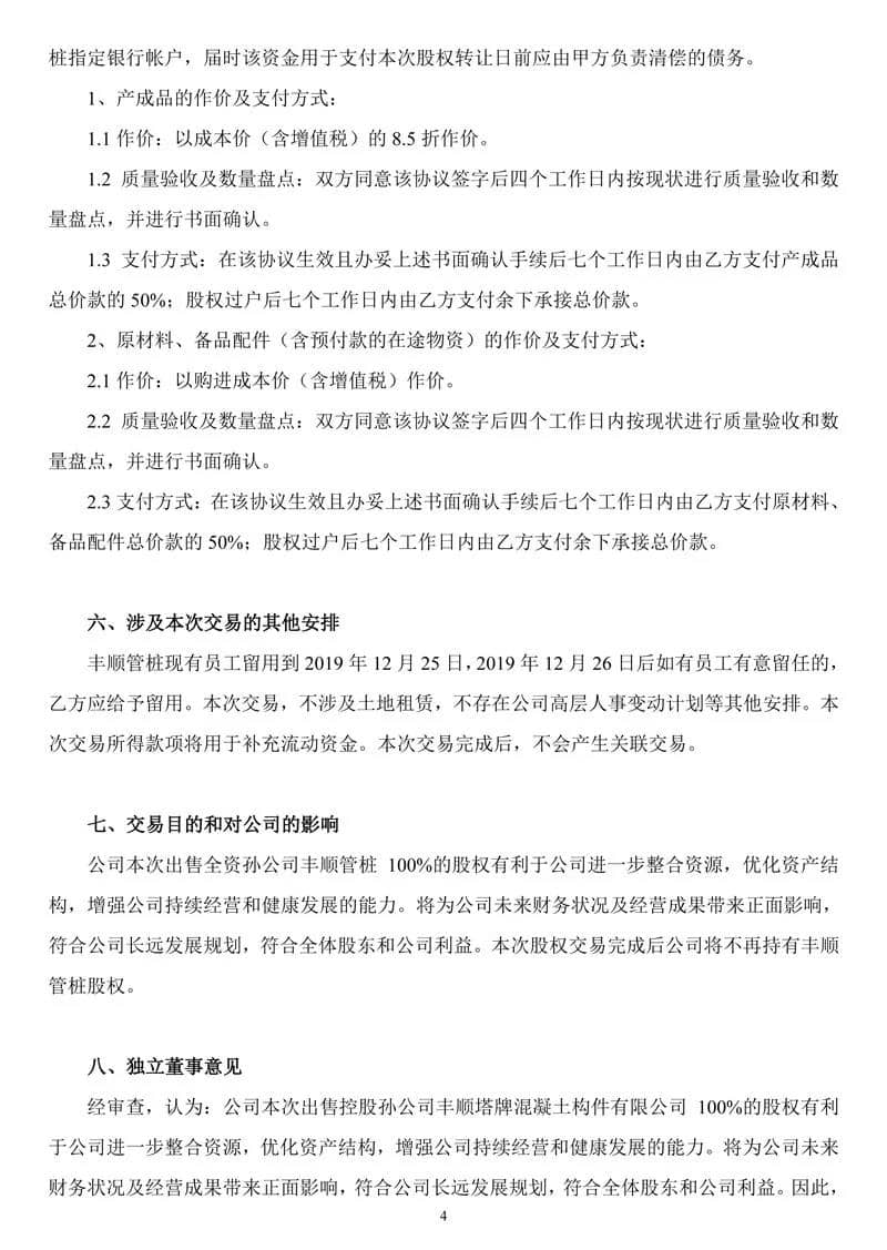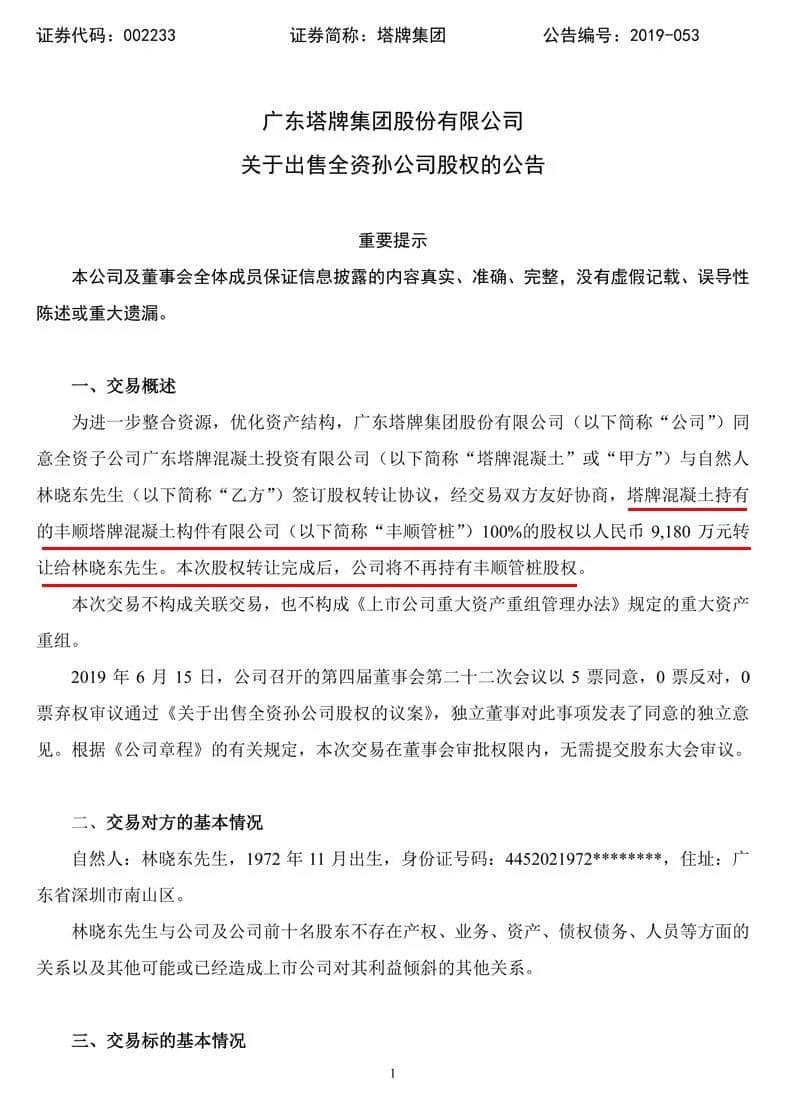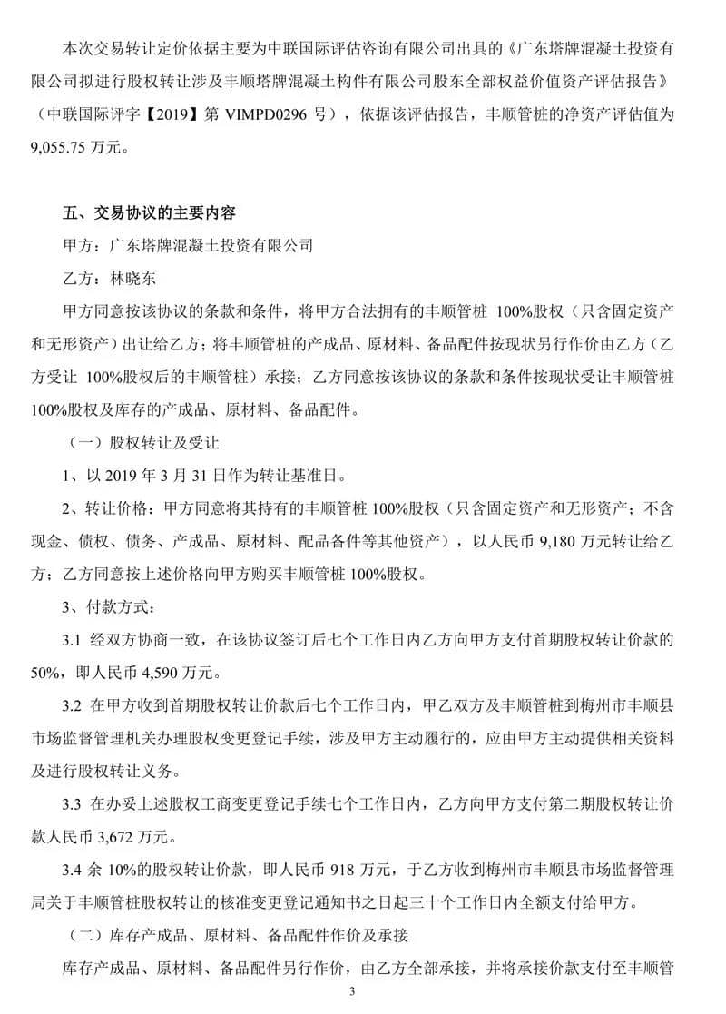 塔牌集团公告披露,为进一步整合资源,优化资产结构,公司同意全资子公司广东塔牌混凝土投资有限公司与自然人林晓东先生签订股权转让协议,经交易双方友好协商,塔牌混凝土持有的丰顺塔牌混凝土构件有限公司100%的股权以人民币9,180万元转让给林晓东先生。本次股权转让完成后,公司将不再持有丰顺管桩股权。