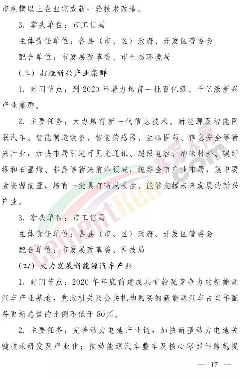 转换发展方式,培育新兴产业方面,要推动传统行业转型发展,深入实施 “三大改造”。2020年年底前力争推广应用机器人1000台以上,省级智能车间 (工厂)达到60个,全市工业化和信息融合发展水平进入全国第一方阵,智能转型走在全省前列。