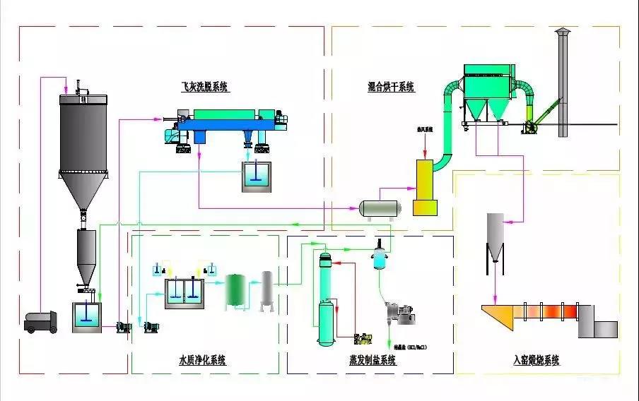 该技术采用水洗提取飞灰中的钾钠硫氯,制成工业产品;余下部分送入水泥窑高温煅烧,飞灰中的重金属经高温熔融后完全固化于水泥熟料晶格中,二噁英在高温水泥窑中彻底分解,且不具二次合成条件;洗灰废水循环利用,零排放;烟气经多级吸附和收尘后达标准排放。完全实现了垃圾焚烧飞灰处置的减量化、资源化和无害化。