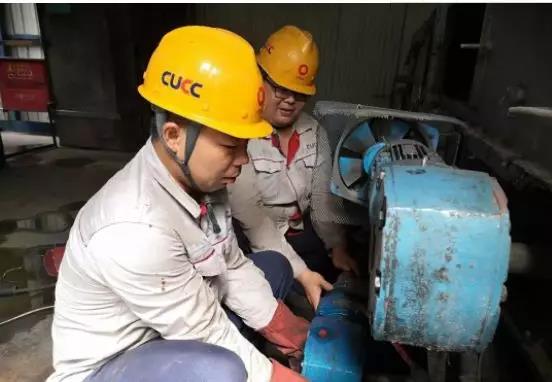 熟料车间维修工刘佳和巡检工张雪松正在1号窑头原煤称对皮带清扫器减速机进行检查,两人相互配合,对原煤称下料口、皮带、减速机、托辊等进行全面细致检查,确保检修质量。