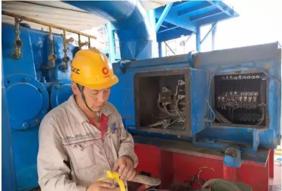 机电车间电气维修工李兵正在对1号窑主电机进行仔细检查。