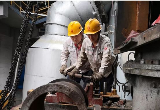 熟料车间维修班长张世勇和巡检工杜明博正在1号煤磨进行设备检修,此刻两人正在对液压缸轴承座进行定位。