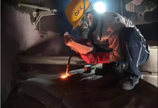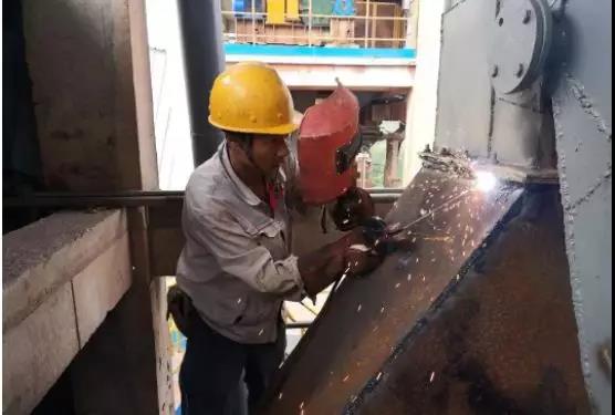 在2号生料立磨,机电车间维修班长宋新奇正在对磨辊进行手工堆焊,为节省检修时间,提高效率,他和田强两人换班作业。