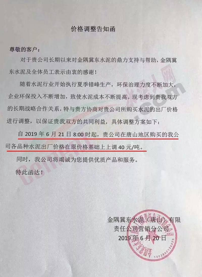 冀东水泥调价通知称:随着水泥行业开始执行夏季错峰生产,环保治理力度不断加大,企业环保投入不断增加,致使水泥成本不断提高。特与客户协商对其购买水泥的出厂价格进行调整,以保证双方共同利益。自6月21日8时起,在唐山地区购买的各品种水泥出厂价在原价格基础上上调20元/吨。