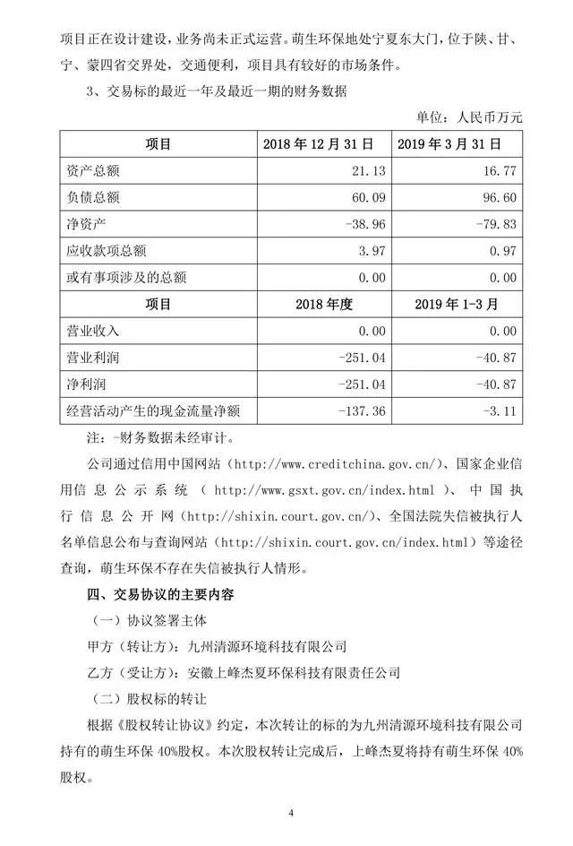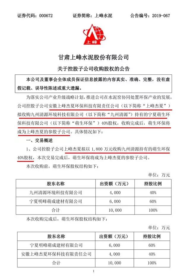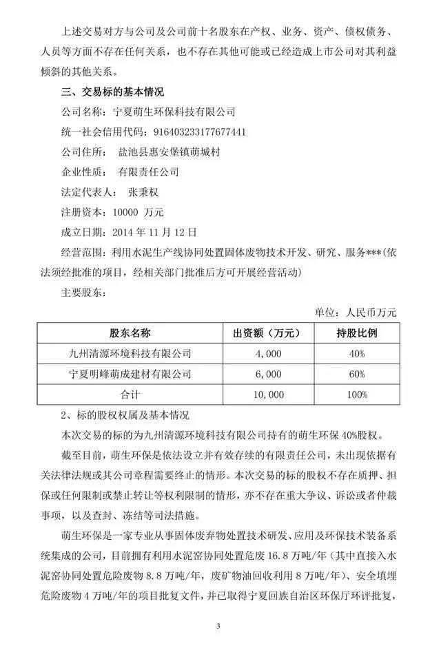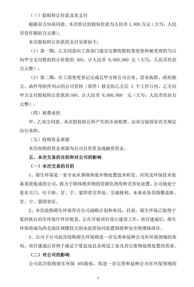 萌生环保是一家专业从事固体废弃物处置技术研发、应用及环保技术装备系统集成的公司,致力于固体废弃物的资源化利用和无害化处置,公司地处宁夏东大门,位于陕、甘、宁、蒙四省交界处,交通便利,未来业务范围覆盖陕、甘、宁、蒙四省区。本次收购萌生环保符合公司战略计划和布局,目前,萌生环保已取得宁夏回族自治区环保厅环评批复,正在开展项目设计建设工作,项目建成后,萌生环保将成为西北地区规模较大的水泥窑协同处置固废和安全填埋场项目。公告原文如下: