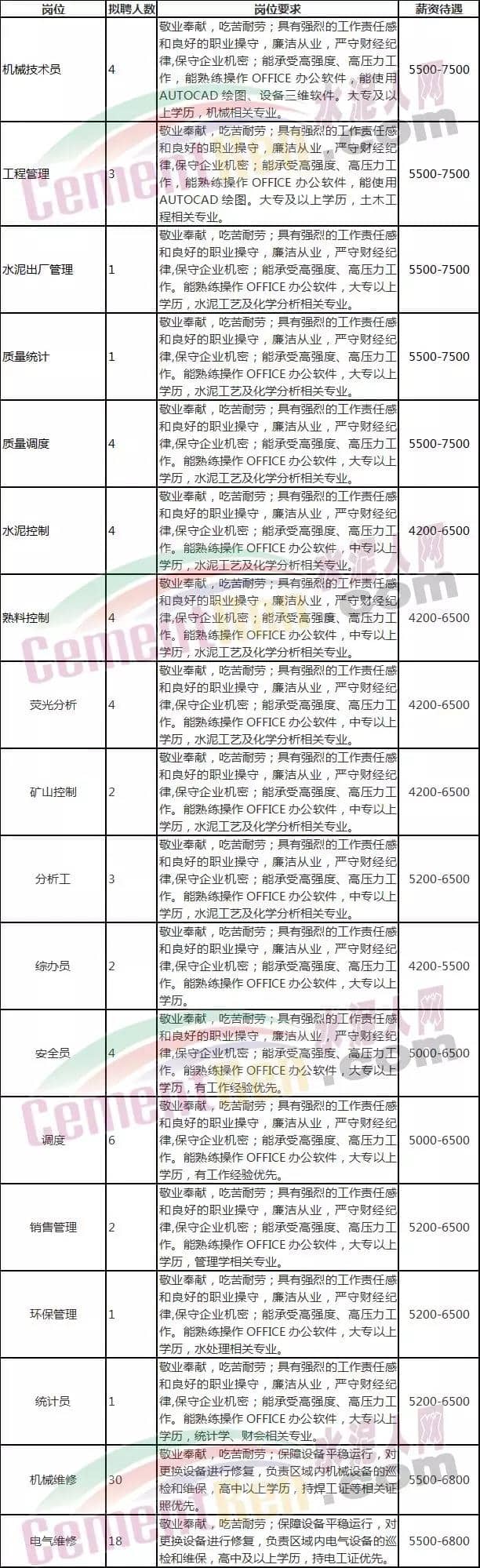 11、电控操作员4人。要求:男女不限,23-40周岁,全日制大专及以上学历,电气自动化、机电一体化、计算机等相关专业,有3年及以上日产3000吨熟料新型干法水泥生产线余热发电工作经验者优先考虑,试用期工资3000元/月,试用期2-3个月;