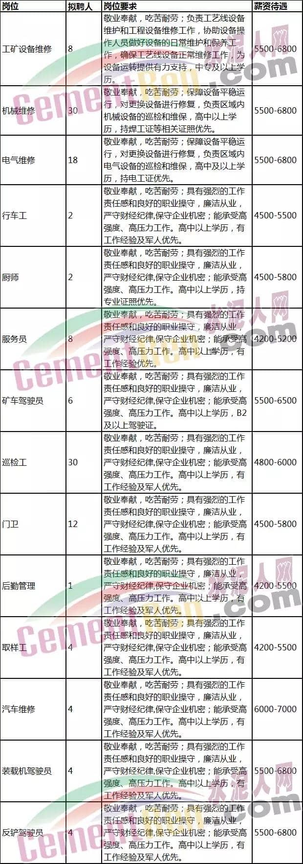 8、设备巡检工20人。要求:男女不限,20-45周岁,高中及以上学历,熟练掌握电焊、氧焊操作技能,身体健康,有责任心,适应三班轮班制。有水泥厂巡检维修工作经验者优先考虑,试用期工资3000元/月,试用期2-3个月;