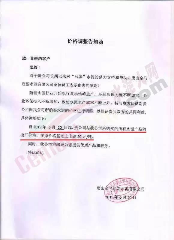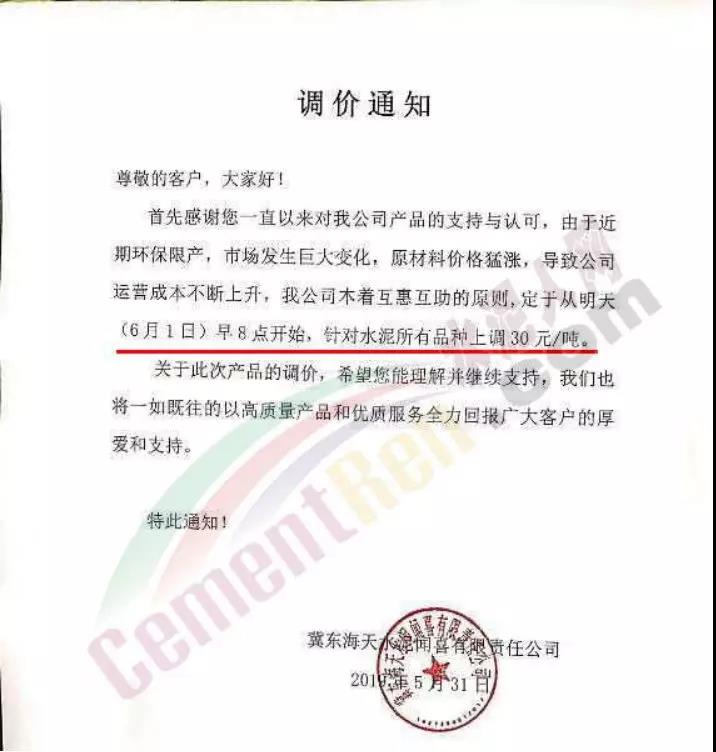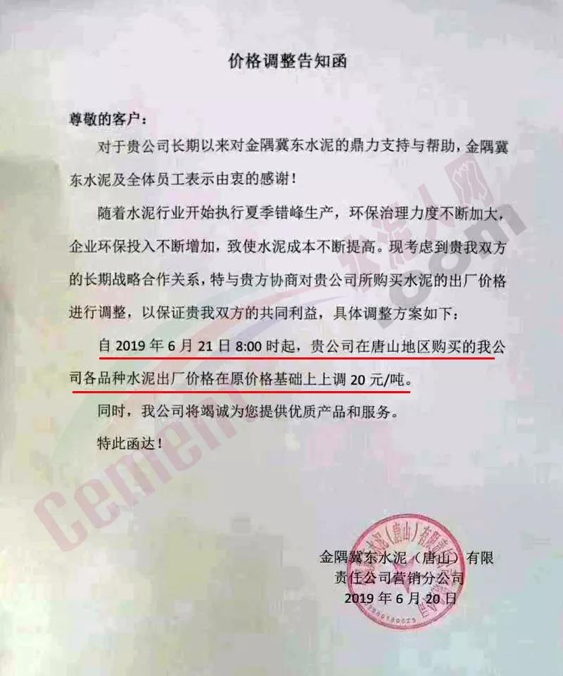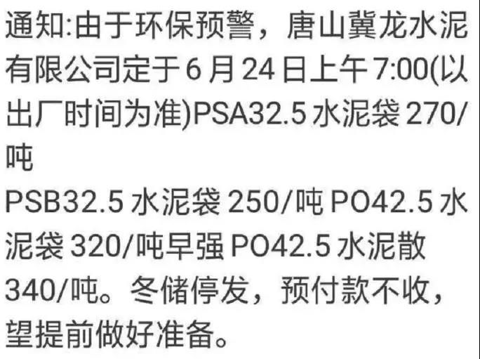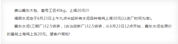 冀东水泥唐山公司等主导企业发布调价通知称:随着水泥行业开始执行夏季错峰生产,环保治理力度不断加大,企业环保投入不断增加,致使水泥成本不断提高。特与客户协商对其购买水泥的出厂价格进行调整,以保证双方共同利益。自6月21日8时起,在唐山地区购买的各品种水泥出厂价在原价格基础上上调20-40元/吨。