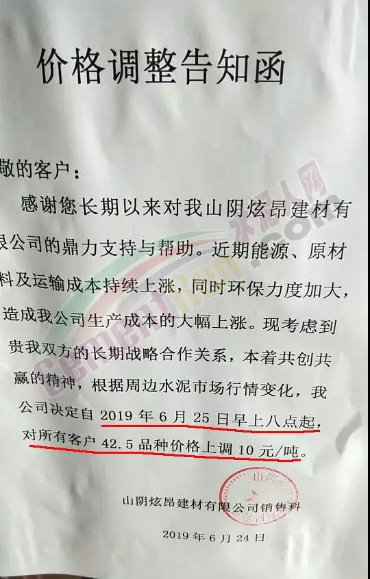 6月25日山西省朔州市山阴炫昂建材有限公司42.5水泥上调10元/吨