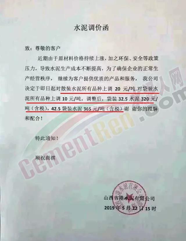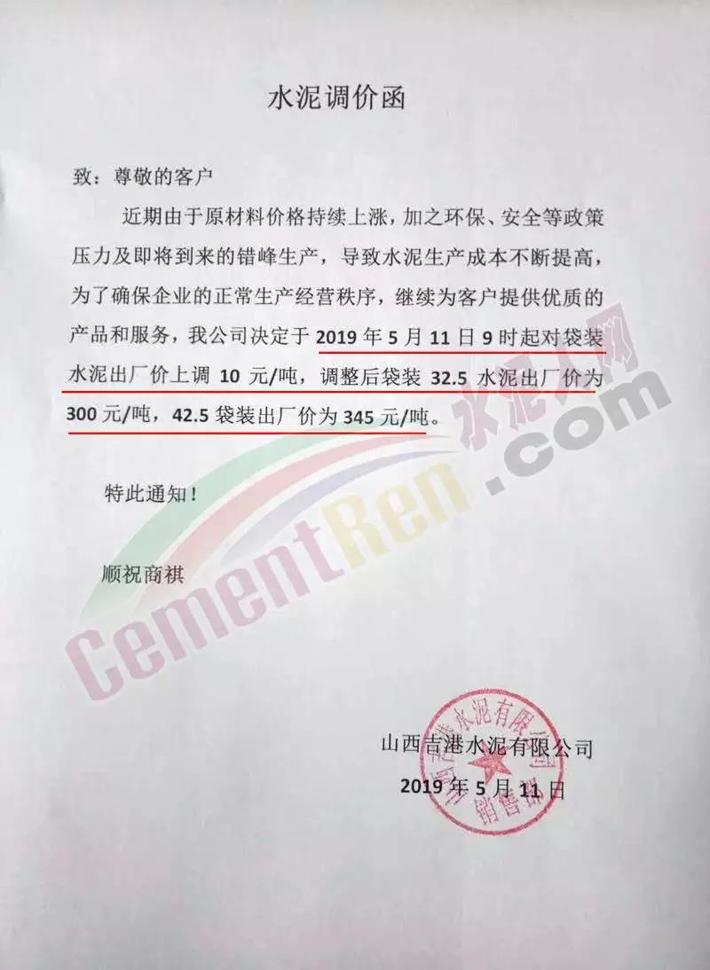 5月22日山西吉港水泥上调水泥价格10-20元/吨