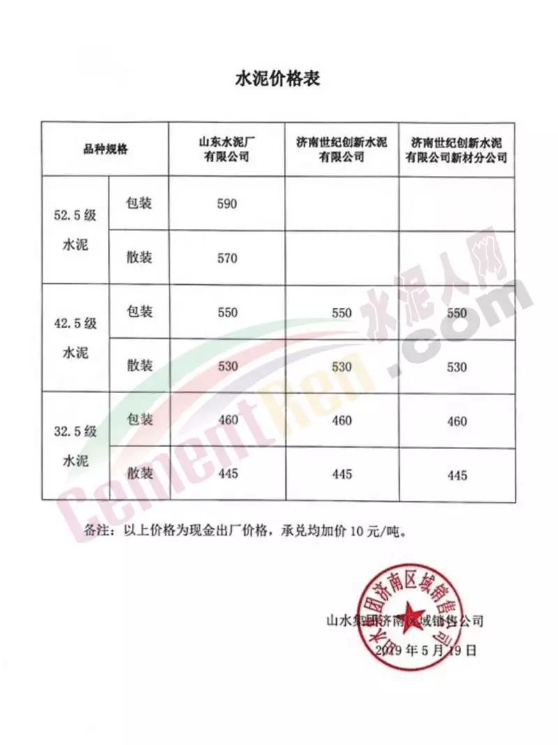 5月19日山水集团济南区域销售公司发布最新《水泥价格表》提到山东水泥厂有限公司、济南世纪创新水泥有限公司、济南世纪创新水泥有限公司新材分公司等三家企业执行最新价格。