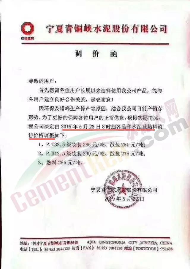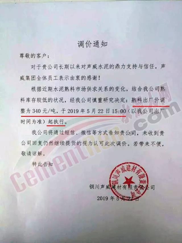 5月22日陕西铜川声威建材上调熟料出厂价格。宜