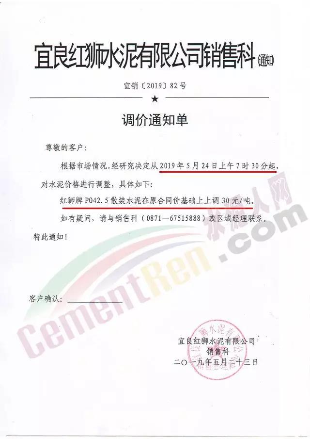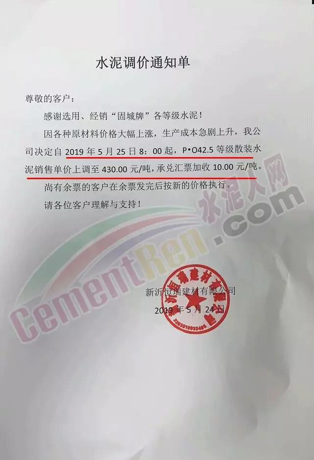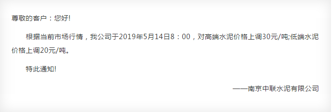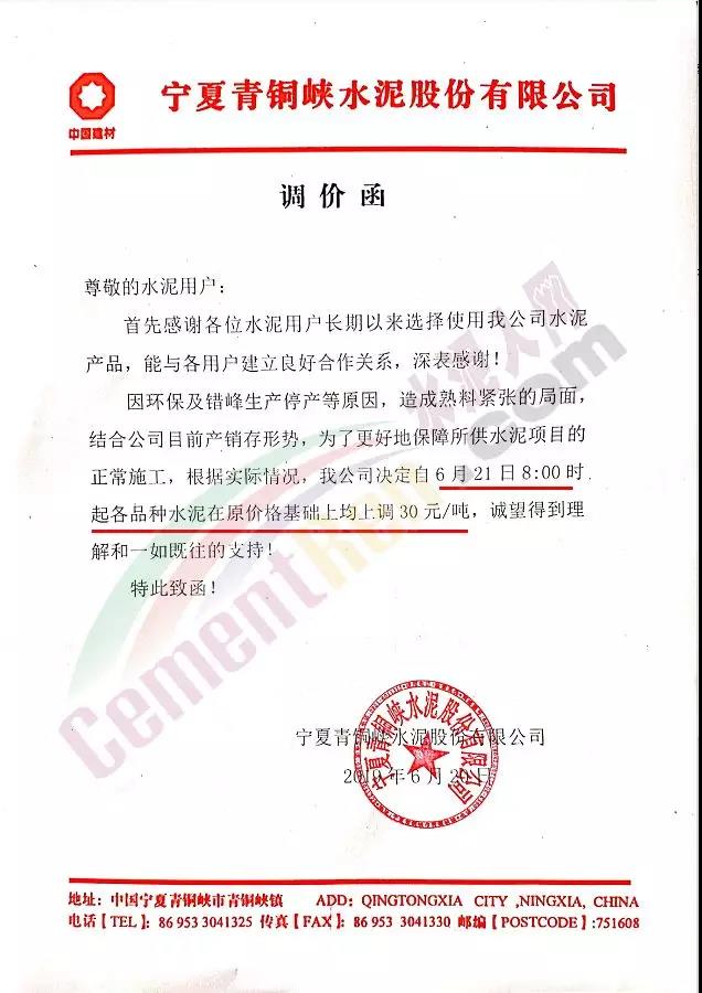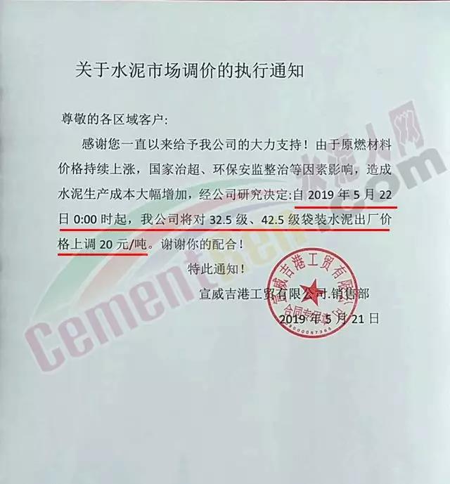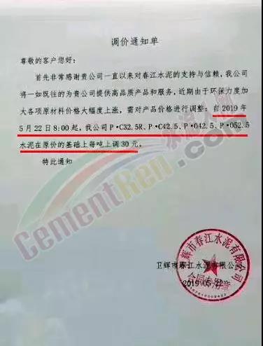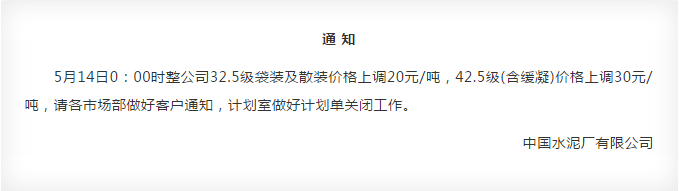 同期,区域内中联水泥及海螺水泥全资子公司中国水泥厂也发布了调价通知。
