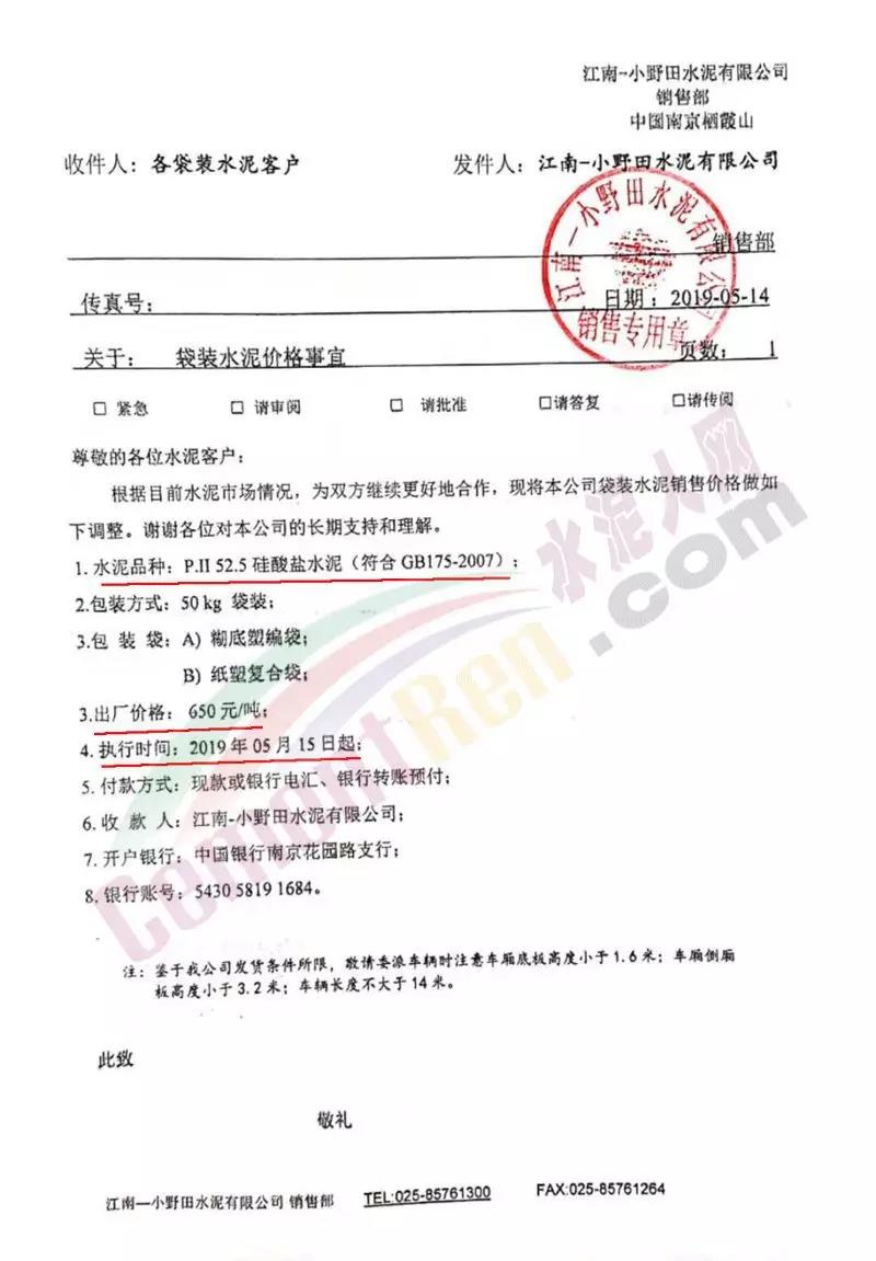 2019年05月15日江苏省南京市的江南一小野田水泥对包装水泥价格上调50元/吨,调整后厂内装车价650元/吨!