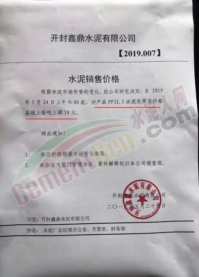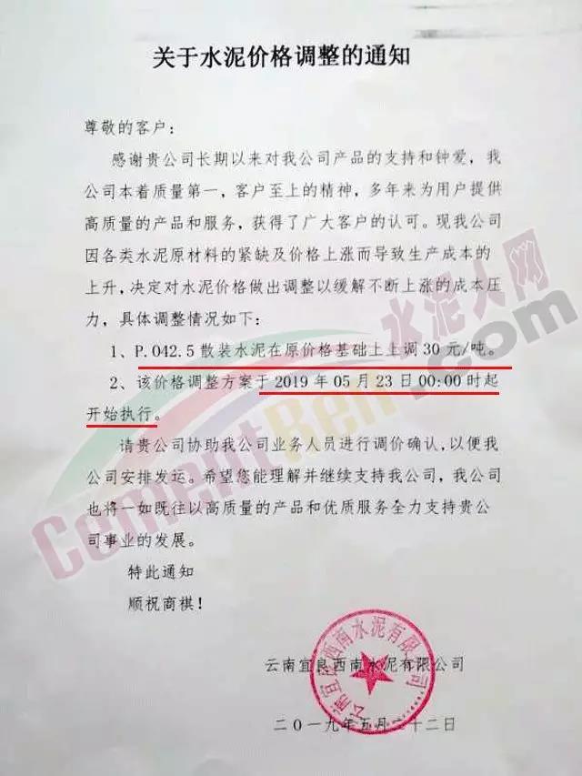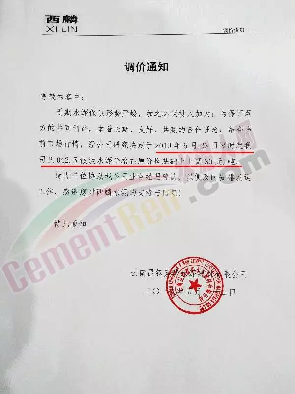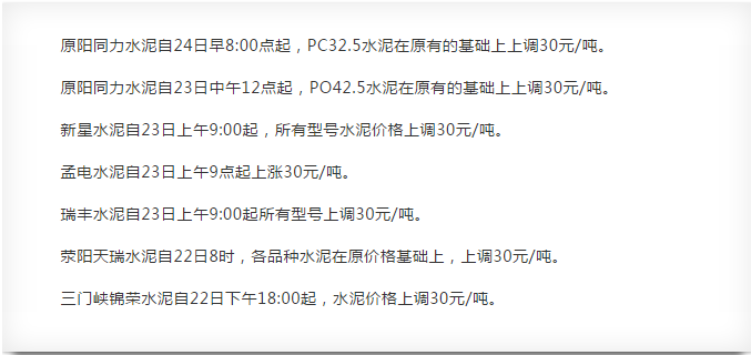 水泥大省河南地区,自5月1日以来,同力水泥、孟电水泥、天瑞水泥、春江水泥等20多家水泥企业宣布涨价,单次涨价幅度在30元/吨左右。部分涨价通知如下: