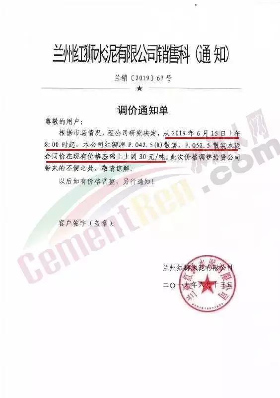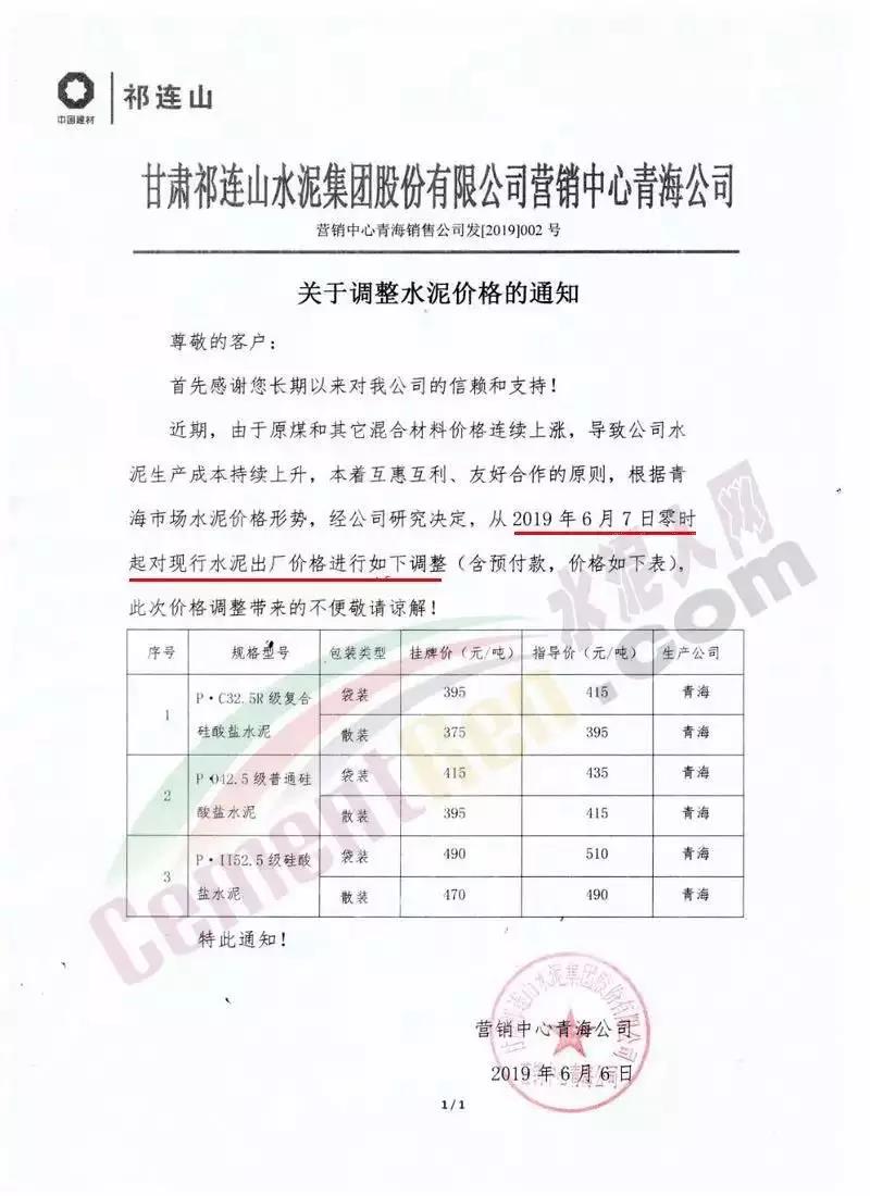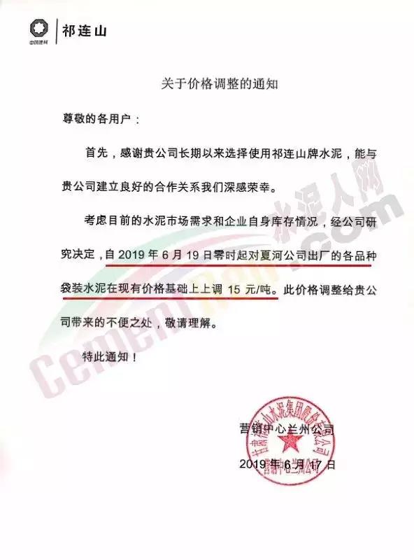 6月19日零时起甘肃祁连山水泥营销中心兰州公司对夏河公司出厂的各品种袋装水泥在现有价格基础上上调15元/吨。