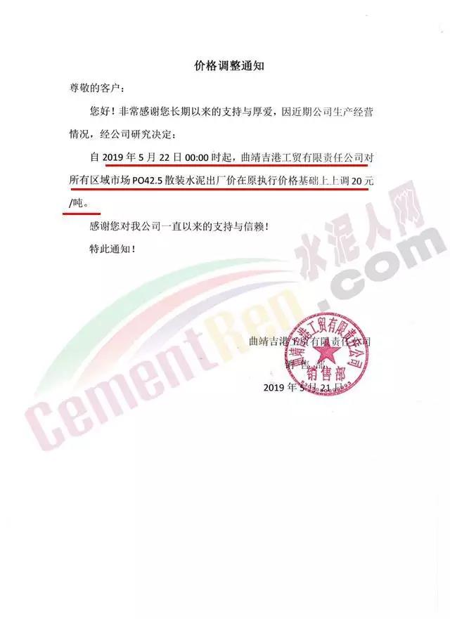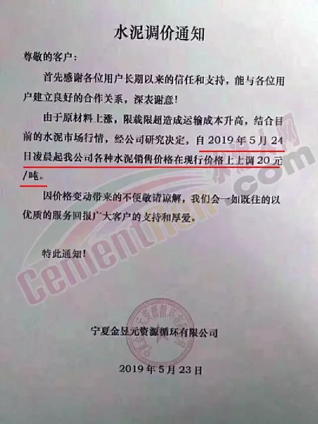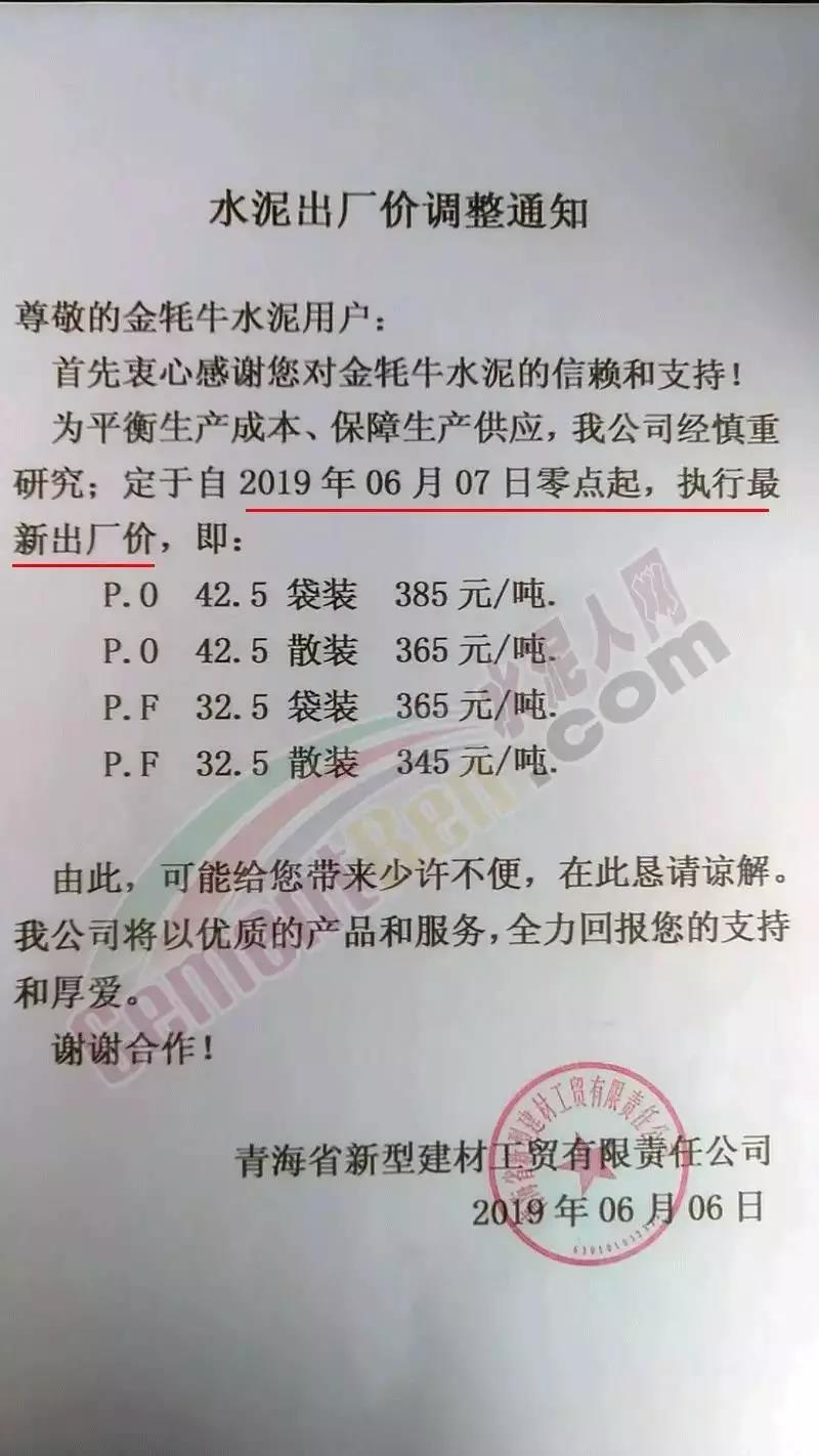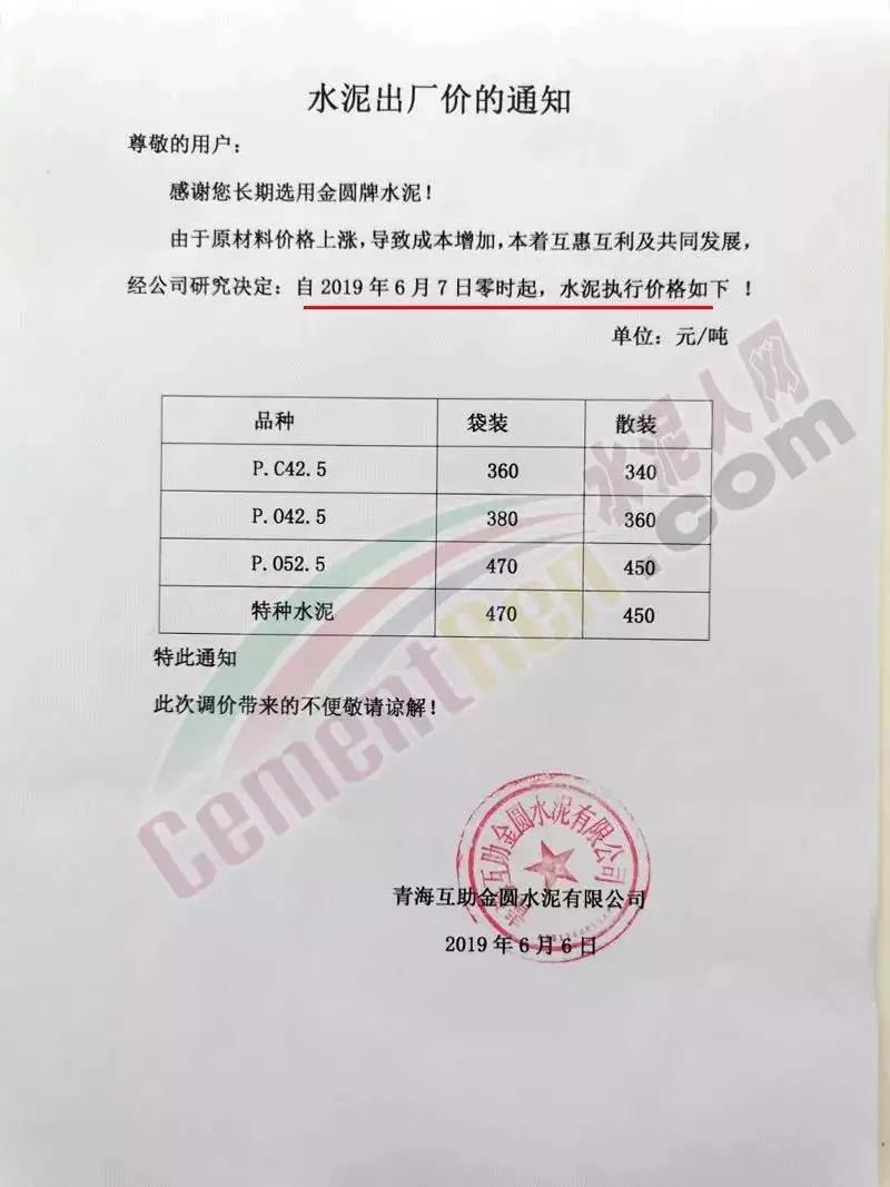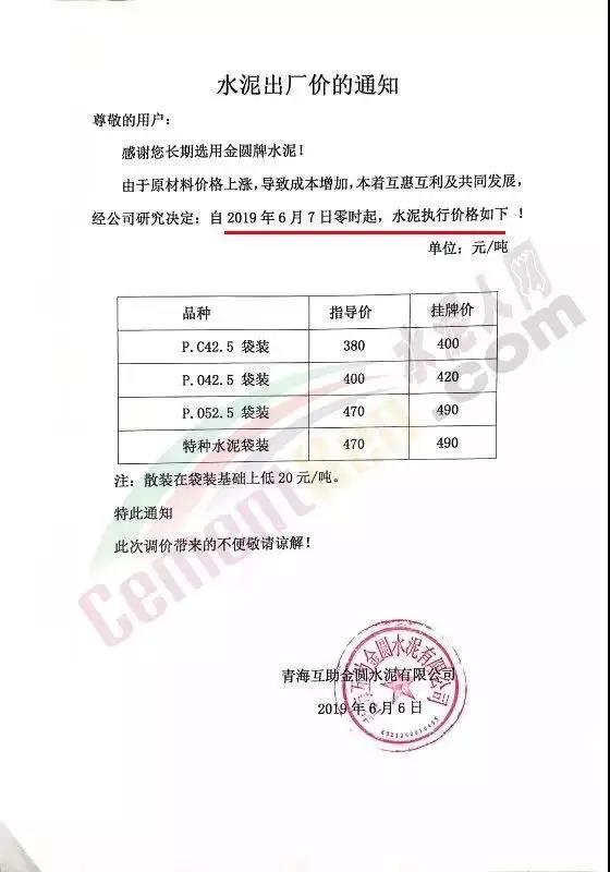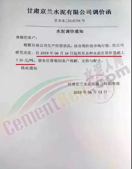 自2019年以来,西北地区的水泥价格一直处于平衡状态,上涨无力,而自5月份以来,甘肃地区的水泥价格出现不同程度的上涨,最高上涨30元/吨。部分涨价通知如下: