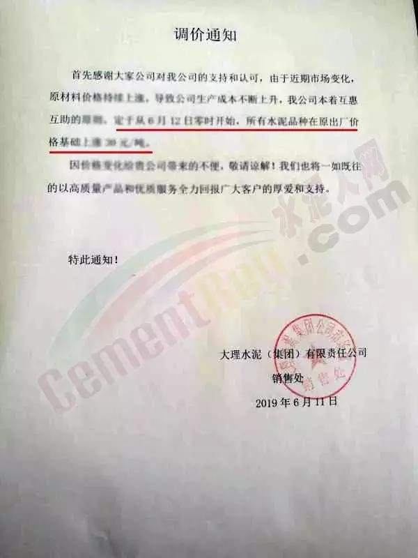6月12日大理水泥(集团)有限公司各品种水泥价格上调30元/吨