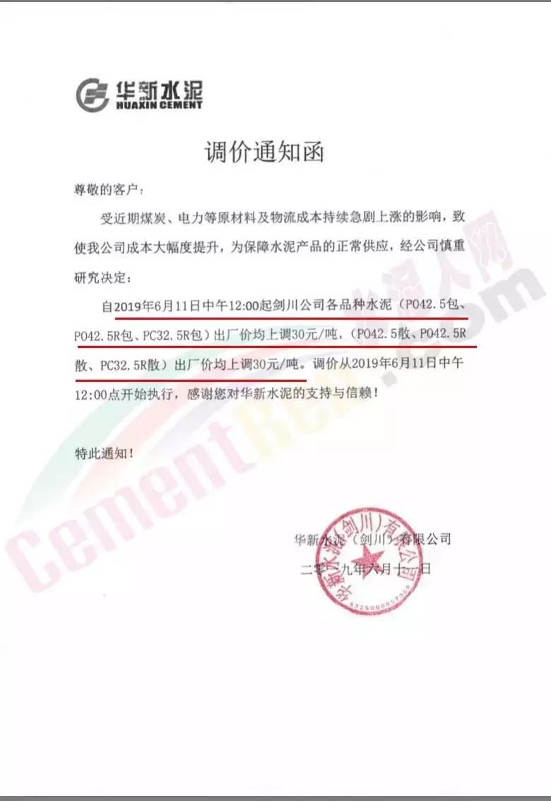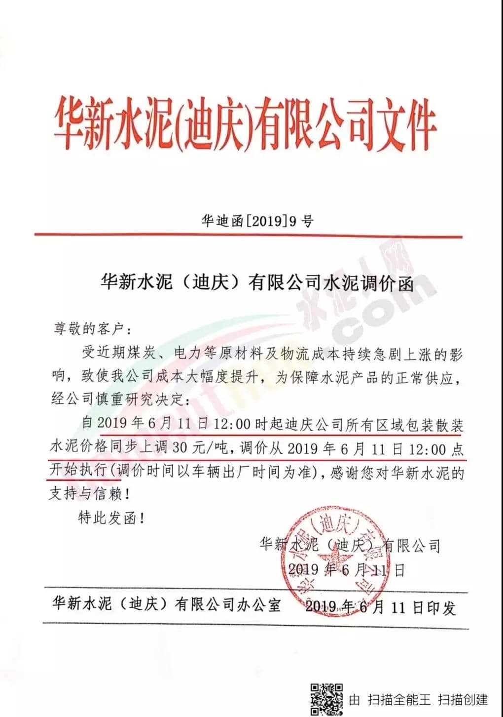 6月11日华新水泥(剑川)有限公司、华新水泥(迪庆)有限公司等水泥价格上调30元/吨
