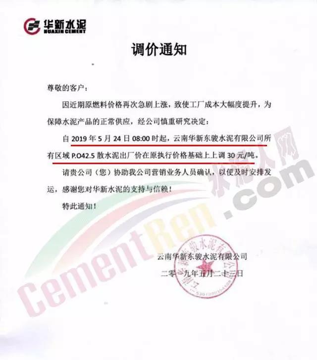 5月24日云南华新东骏水泥有限公司42.5散装水泥上调30元/吨。