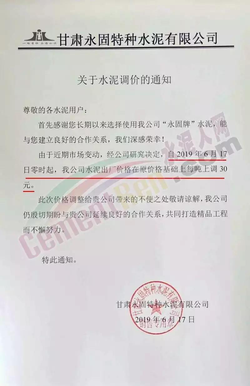 6月17日甘肃永固特种水泥有限公司水泥出厂价格在原价格基础上每吨上调30元