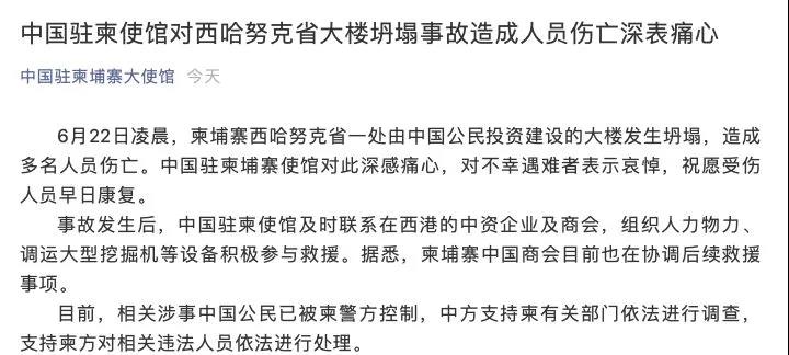 下面是中国驻柬埔寨大使馆官方微信公众号的发文:中国驻柬使馆对西哈努克省大楼坍塌事故造成人员伤亡深表痛心。