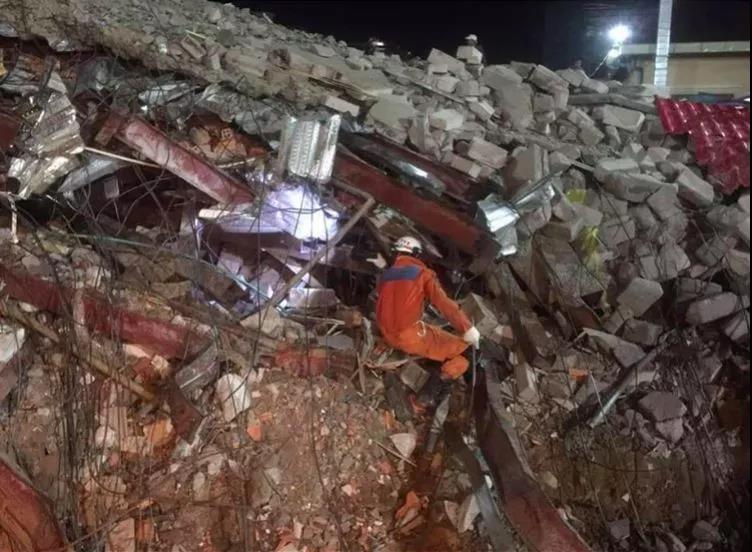 现场图片显示,戴着安全帽的救援人员穿过地面上的钢筋水泥,将伤者运送至救护车,同时挖掘机将倒塌后的建筑废料分流到一边。大量伤者的亲属则在事故地点附近等待消息。