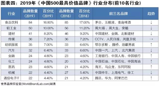 本年度《中国500最具价值品牌》排行榜中,共有来自食品饮料、轻工业、建材、传媒、纺织服装、医药、机械等在内的27个相关行业的品牌入选。其中,建材行业入选数量为41个,位居第三。