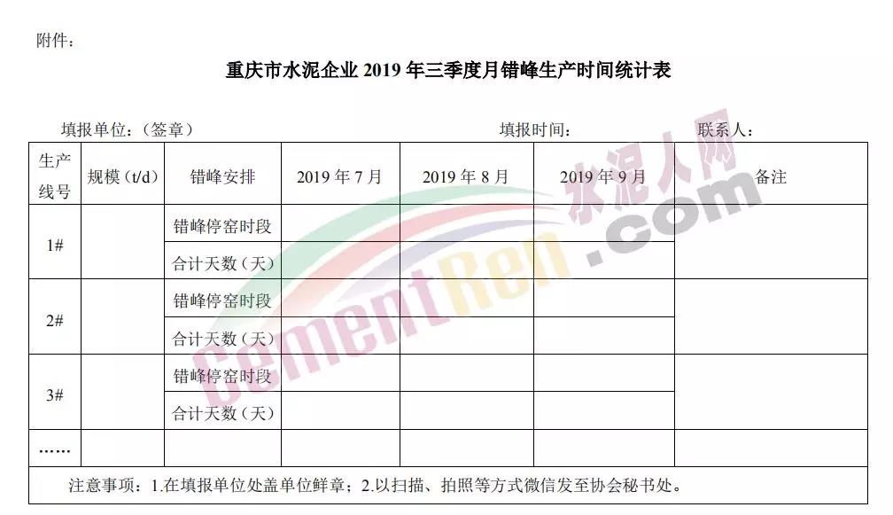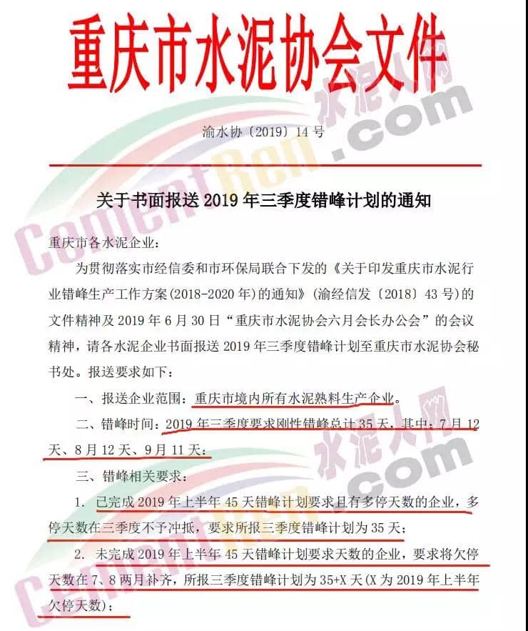 据水泥人网消息,7月1日,重庆市水泥协会发布《关于书面报送2019年三季度错峰计划的通知》,为贯彻落实市经信委和市环保局联合下发的《关于印发重庆市水泥行业错峰生产工作方案(2018-2020 年)的通知》(渝经信发〔2018〕43 号)的文件精神及2019年6月30日“重庆市水泥协会六月会长办公会”的会议精神,请各水泥企业书面报送2019年三季度错峰计划至重庆市水泥协会秘书处。报送要求如下: