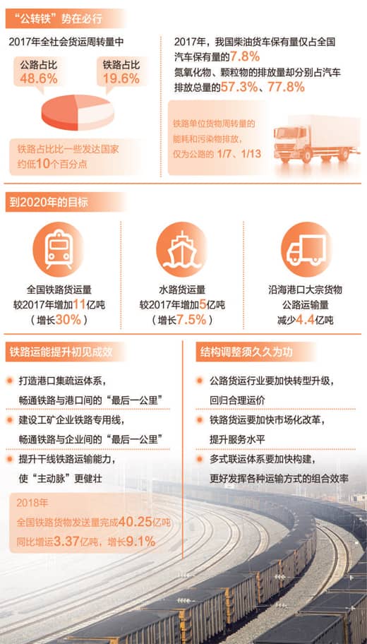 去年9月,国务院办公厅正式印发《推进运输结构调整三年行动计划(2018—2020年)》(简称“行动计划”),提出了明确的任务与目标——任务涵盖铁路运能提升、公路货运治理、多式联运提速等“六大行动”;目标则是以大宗货物运输“公转铁、公转水”为主攻方向,通过三年集中攻坚,实现全国铁路货运量较2017年增加11亿吨(增长30%)、水路货运量较2017年增加5亿吨(增长7.5%)、沿海港口大宗货物公路运输量减少4.4亿吨。为此,交通运输部会同铁路、民航等部门成立了运输结构调整工作组,合力推动此项工作。
