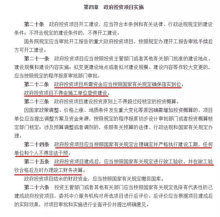 1、禁止“垫资施工”:政府投资项目不得由施工单位垫资建设。